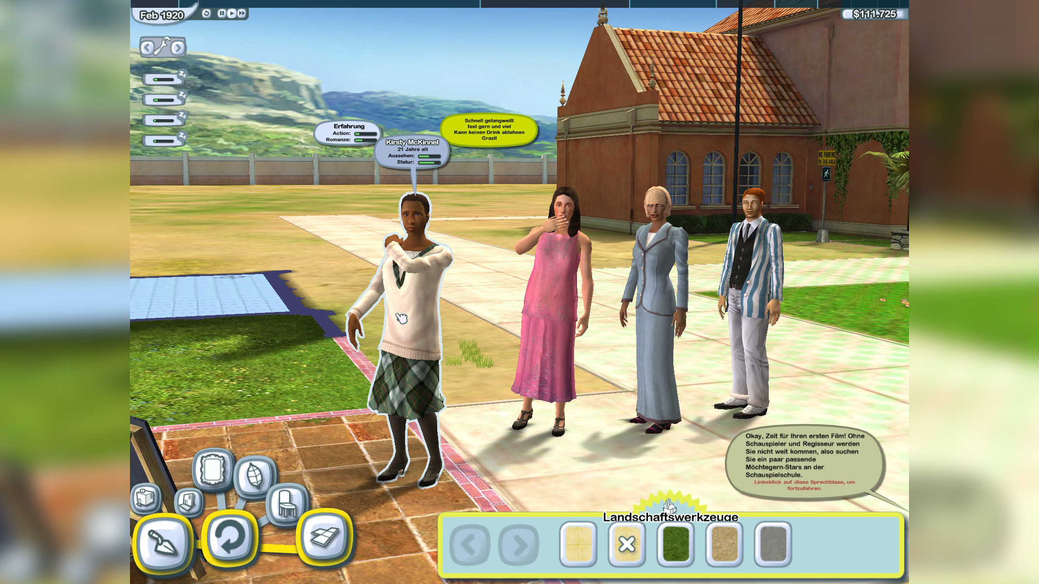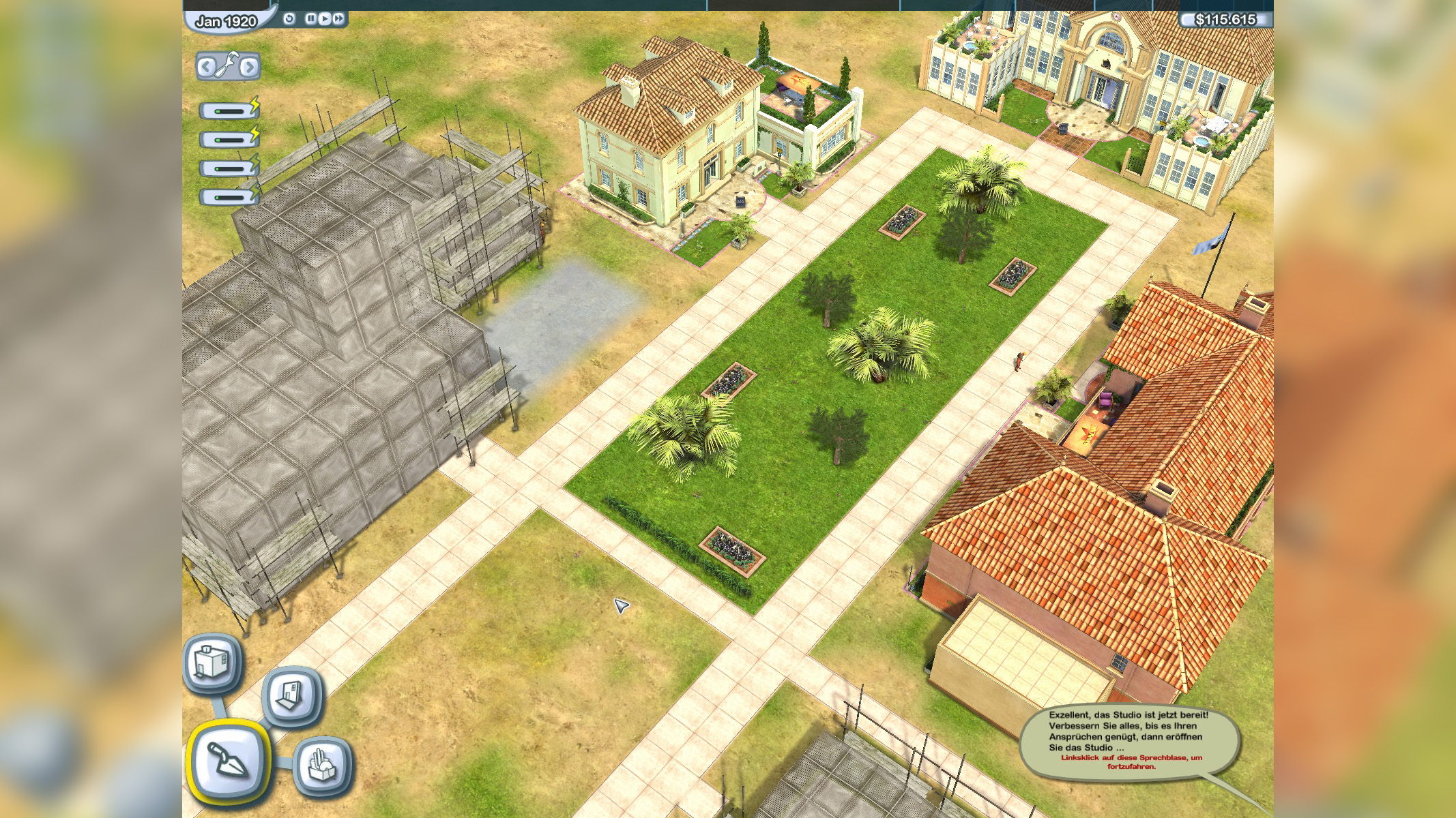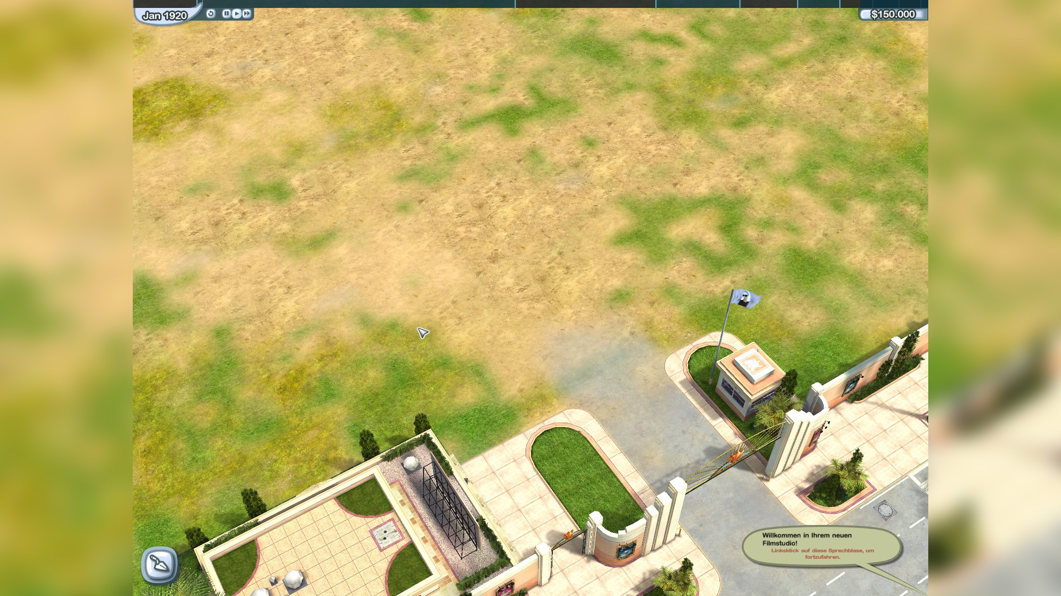 So beginnt der Aufstieg unseres eigenen Hollywood-Studios in The Movies: Wenn wir unsere Reise als angehende Traumschmieder beginnen, führt uns zuerst ein kurzes Tutorial ein. Haben wir das abgeschlossen, starten wir mit einem Anblick, der Aufbau-Experten sofort bekannt vorkommt: Eine große, grüne Fläche. Naja, grün-braun. Kalifornien eben.
