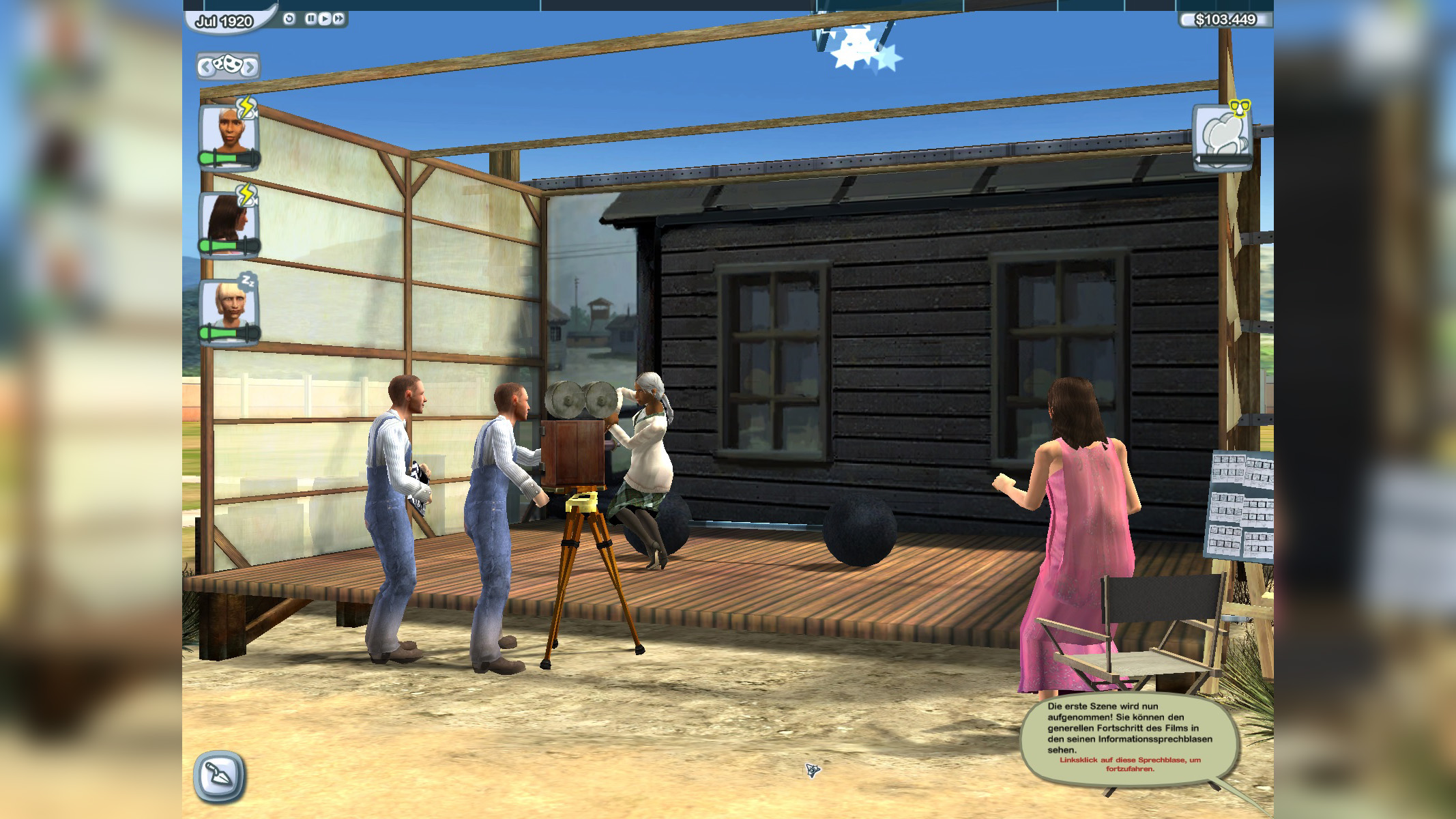 Doch braucht ein Film natürlich mehr als nur pure Star-Power – wer hält denn sonst die Kamera? Auch eine Crew heuern wir an. Die hat zwar keine Bedürfnisse, dafür erhält sie für jeden Film Erfahrung, die sich langfristig ebenfalls in den Filmkritiken wiederfindet. Auch Handwerker brauchen wir, um neue Sets zu bauen, das Studio-Gelände vom Schmutz zu befreien und alle Gebäude instand zu halten. Statisten stellen wir für unsere Filme ebenfalls ein. Die lernen mit jeder Produktion in dem jeweiligen Genre dazu und können später zu vollwertigen Stars aufsteigen.