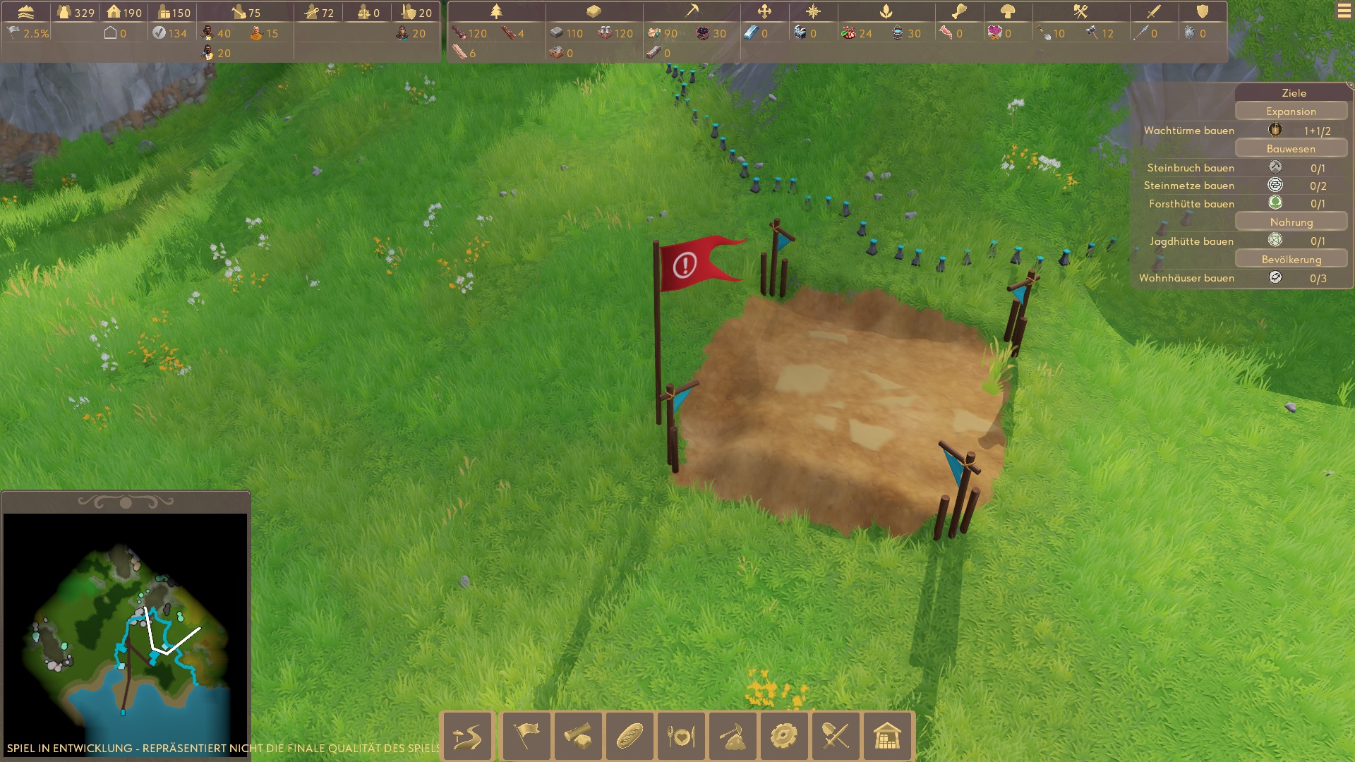 Also: Wachtürme müssen her. Die dienen meiner Siedlung nicht nur als Verteidigungen und Sammelplätze für Einheiten und Patrouillen, sondern auch zum Erweitern der Grenzen. Warum? Ist doch klar: Die bereits vom Spiel gelegten Grenzsteine müssen mühsam aus dem Erdreich geklöppelt und an anderer Stelle wieder eingesetzt werden. Das machen die Pioniere wirklich!