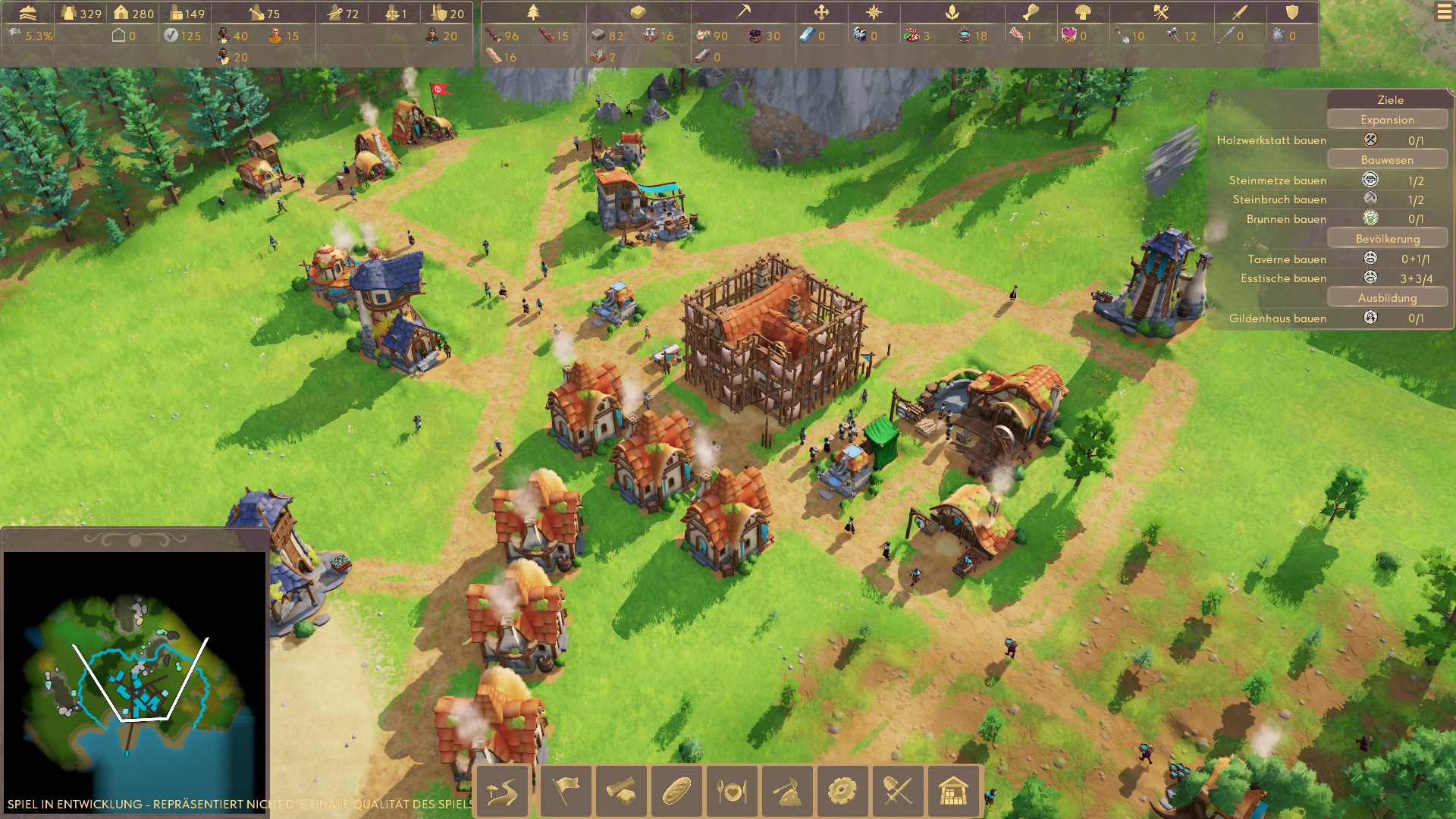 Das UI verunsicherte mich anfangs ebenfalls etwas. So war mir nicht sofort klar, wie ich sehe, ob ich genügend Häuser für meine Pioniere habe. Auch wusste ich nicht, warum ich Steinpilze sammle und Hirsche jage, mir das Spiel aber oben in der Leiste nur Himbeeren und Hasen anzeigt. Nach einigem Ausprobieren, Maus-Hovern und Rumklicken dauerte es nur einige Minuten, hinter das Meiste zu kommen. Ein Tutorial für Einsteiger sollte zum Release aber drin sein!