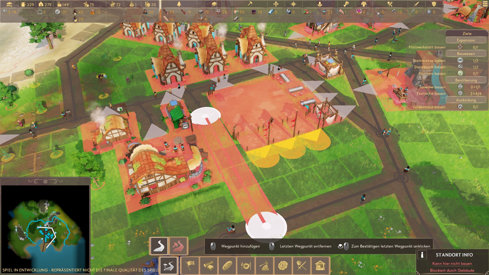 Die Menüs sind übersichtlich, doch sehr schmucklos gestaltet. Das Overlay ist aber mit Sicherheit noch nicht final, das wird häufig erst später in der Entwicklung gemacht. Die Gebäude sind frei platzier- und drehbar. Auch hier müssen wir uns weder Kacheln noch Kästchen unterwerfen. Wie bei den Wegen wird es bei Engstellen schnell fummelig, vor allem das Drehen von Gebäuden. Haben wir aber Platz, geht das Bauen gut von der Hand.